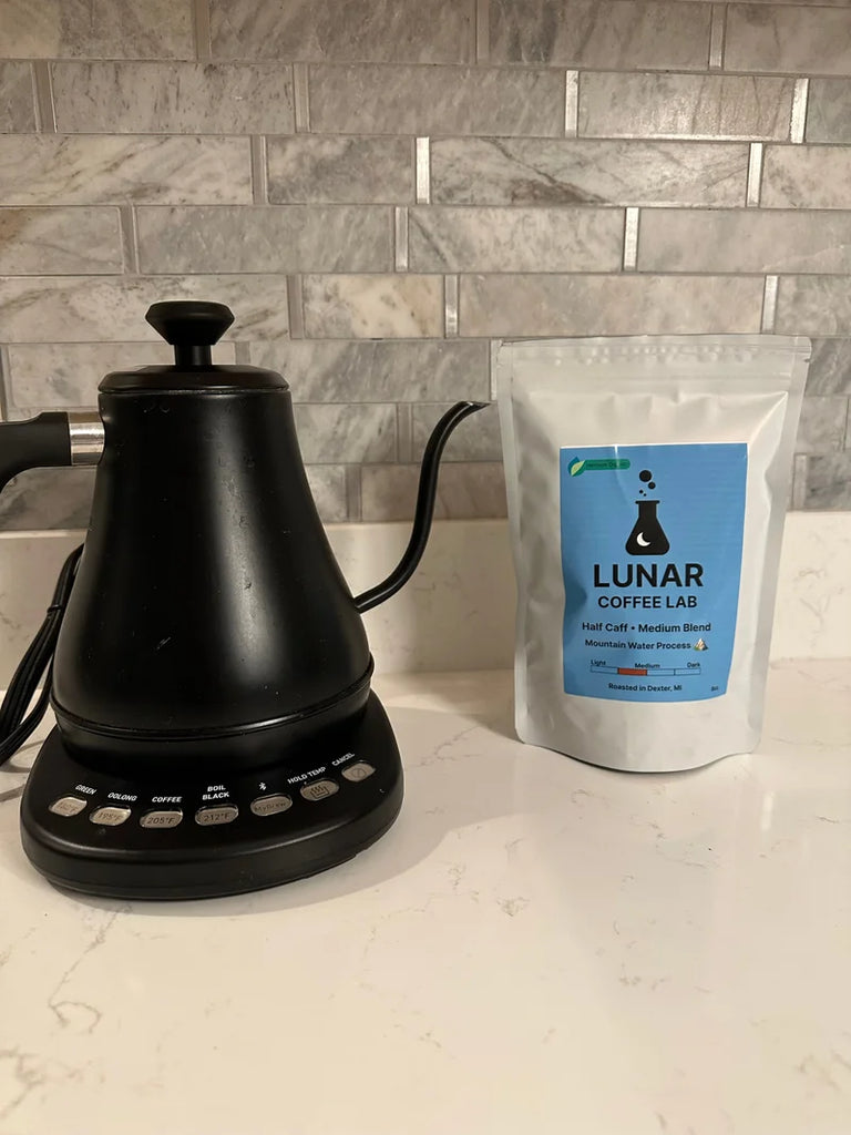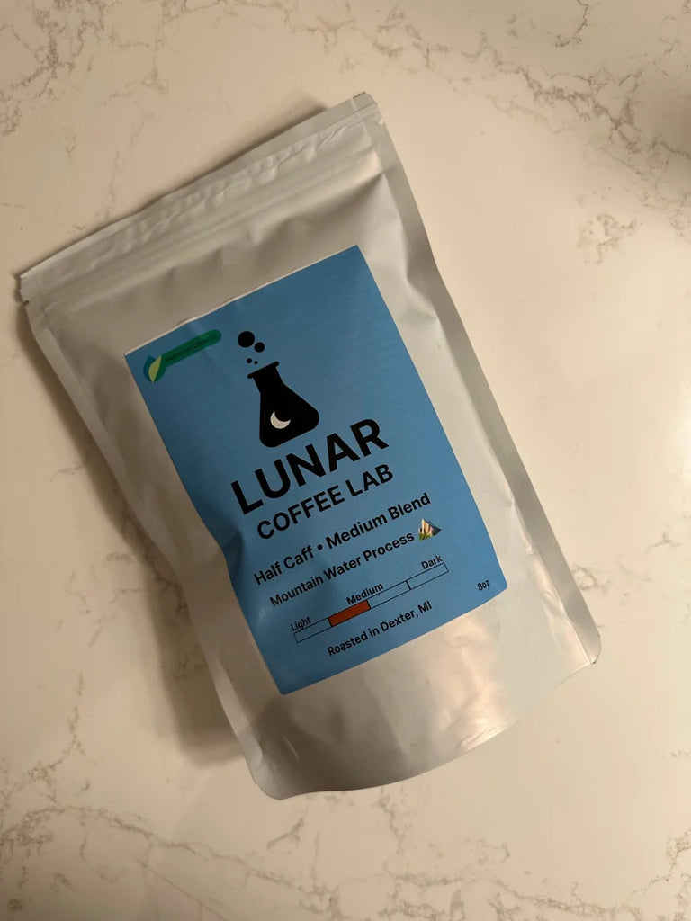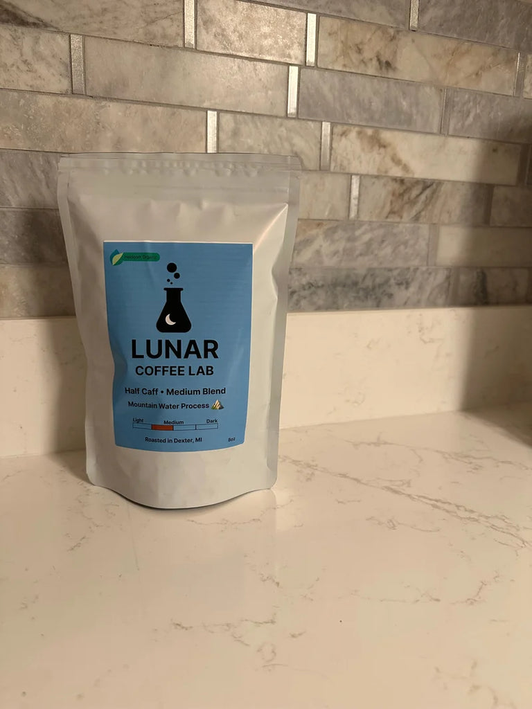 Lower your caffeine level while preserving flavor and health benefits with this delightful medium roast half-caff coffee!